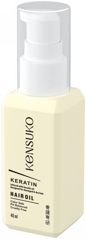 KENSUKO „Keratin Hair Oil lengvos tekstūros aliejus plaukams su keratinu, skirtas sausų ir pažeistų plaukų priežiūrai. Formulė su Keratin Amino Complex Protein padeda puoselėti plaukų išvaizdą, gali suteikti glotnumo, vizualinės apimties ir pilnesnių plaukų efektą. Reguliariai naudojant priemonė gali padėti sumažinti plaukų lūžinėjimo požymius bei suteikti plaukams švelnumo ir žvilgesio.