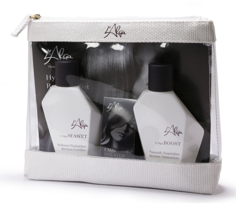 L’Alga“ plaukų priežiūros priemonių rinkinį sudaro: atstatomasis šampūnas plaukams „Seawet Shampoo“, 100 ml, kondicionierius plaukams „Boost Conditioner“, 100 ml ir losjonas po plaukų dažymo ar cheminių procedūrų „Bolster Lotion“, 12 ml.