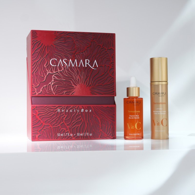Casmara „Beauty Box“ rinkinį sudaro Casmara „Sensations Hydro Revitalizing Cream“ veido kremas ir Casmara „Sensations Vitamin Shot Serum“ veido serumas.